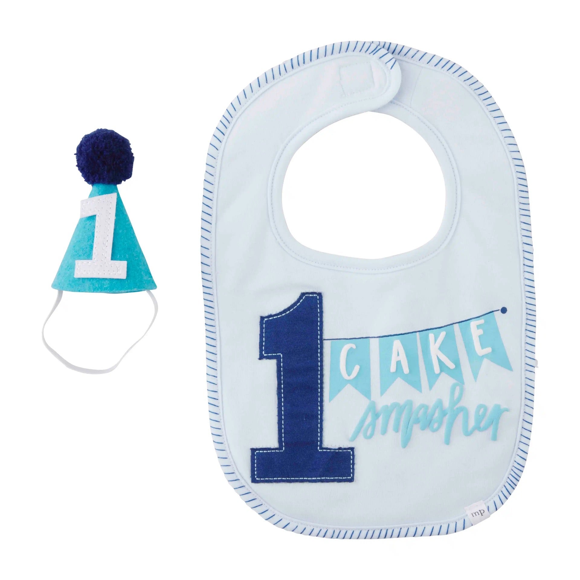 Throw a birthday bash, or smash, with our Banner Boy Cake Smash Set. The two piece set comes with an appliqued interlock bib. The bib features a #1 with the phrasing "Cake Smasher". The set also comes with a coordinating felt party hat, complete with a pom at the top.