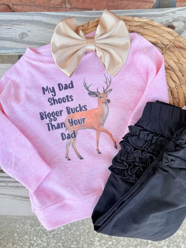 Keep your little one cozy and cute in the "My Dad Shoots Bigger Bucks" pullover. Perfect for babies with a playful spirit, this adorable sweatshirt adds a fun twist to everyday wear. Soft, comfortable, and irresistibly charming, it’s a sweet way to celebrate dad’s big-game stories while making your baby the star of any family outing.