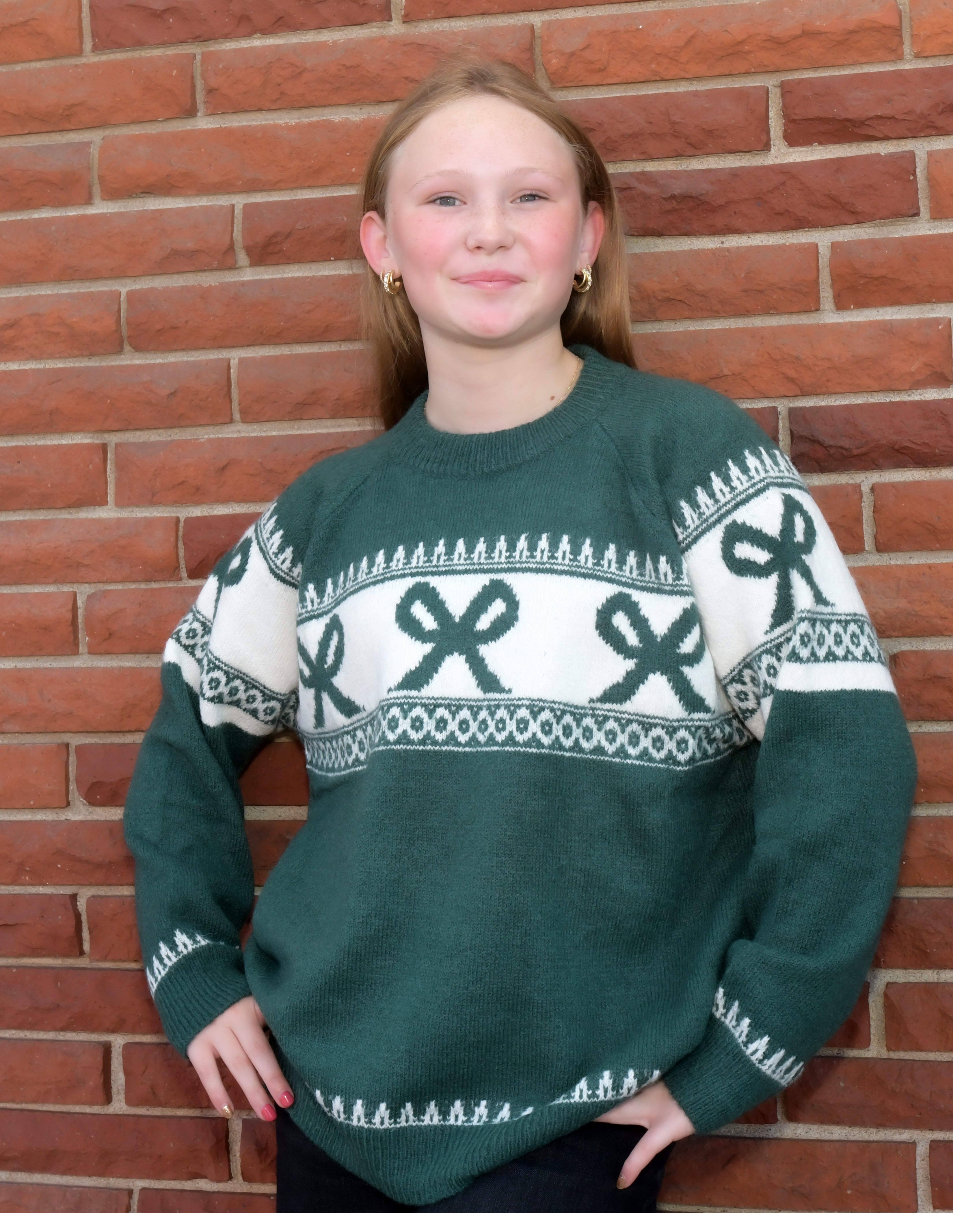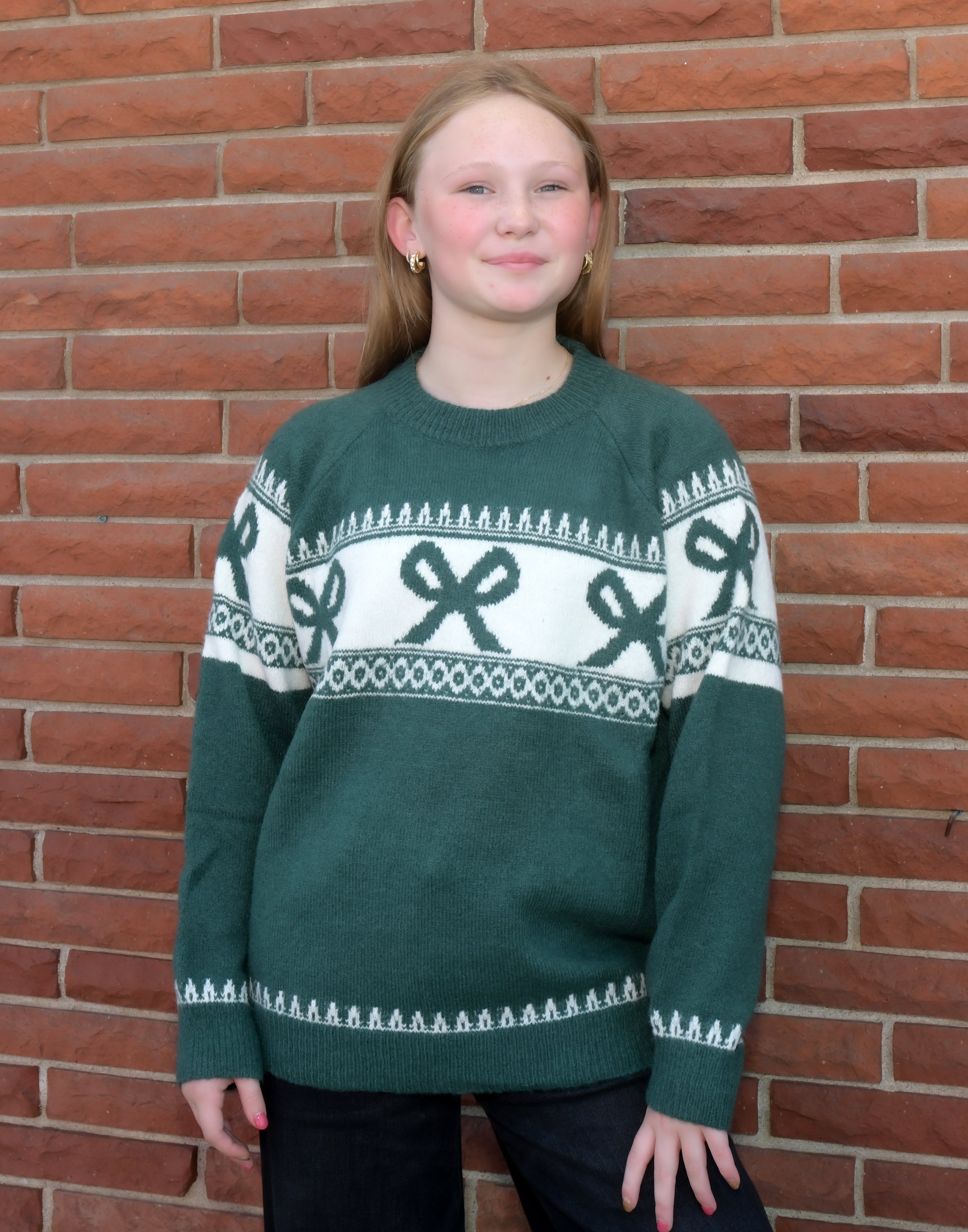 Snuggle up in the Evergreen Bow Knit Sweater, designed with cozy comfort and playful style in mind. Perfect for tweens or ladies who love a cute, relaxed fit—our model wears a small but usually fits size 12. Keep it fresh by washing cold inside out and letting it hang to dry. This sweater is sure to brighten any chilly day!