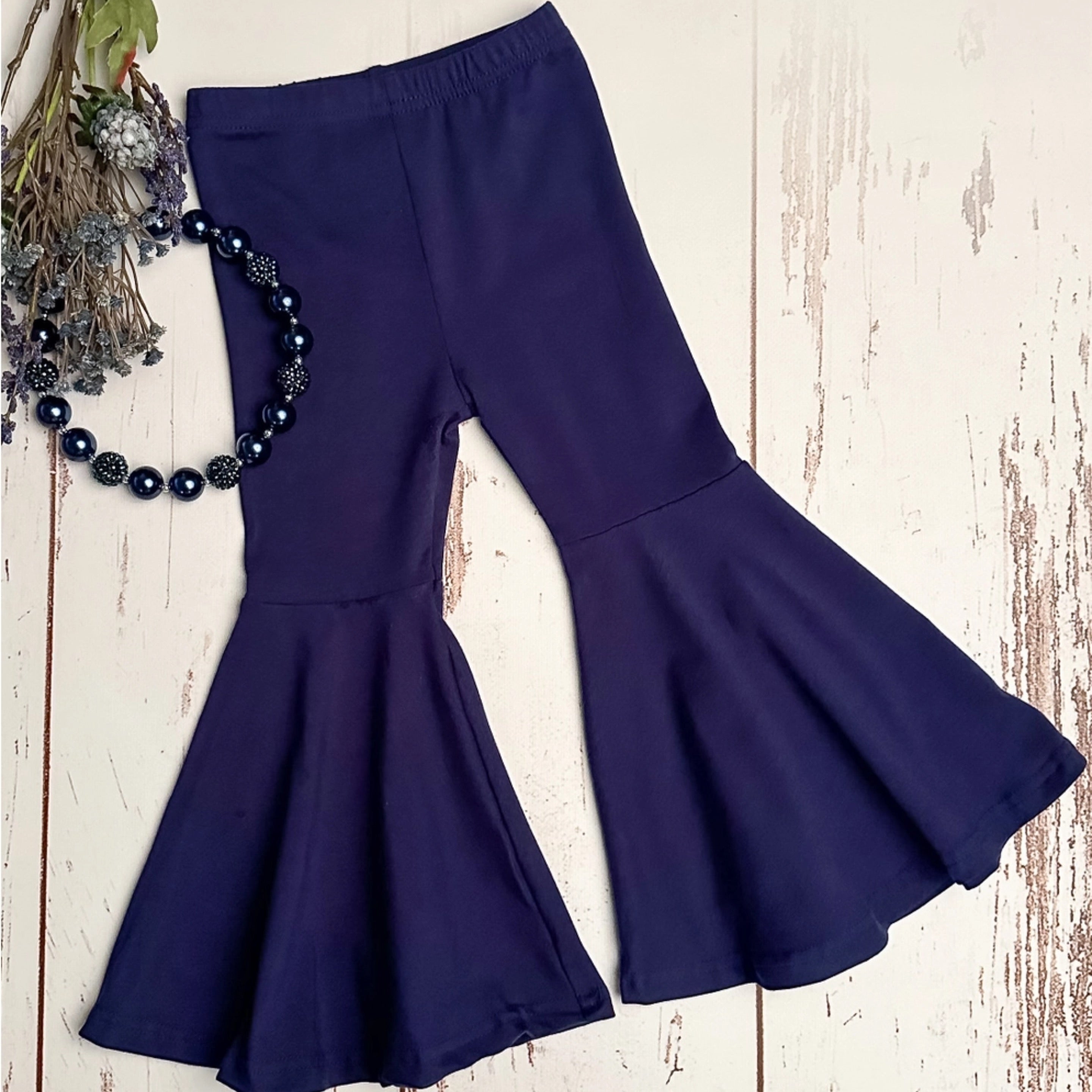 Solid navy pull on style bell bottom pants with elastic waistband for girls.