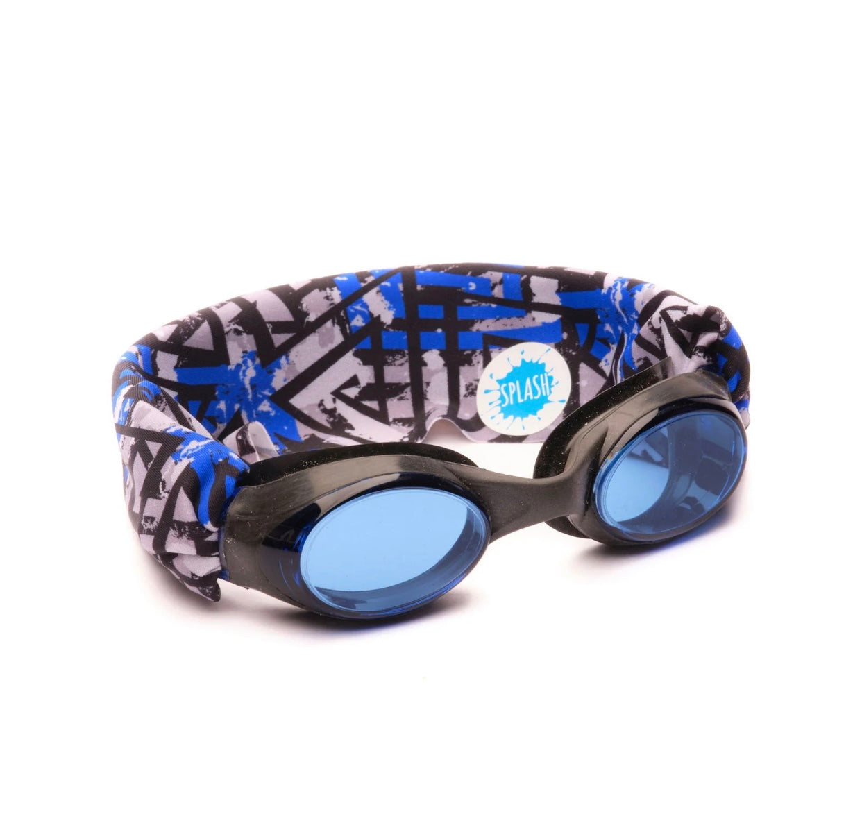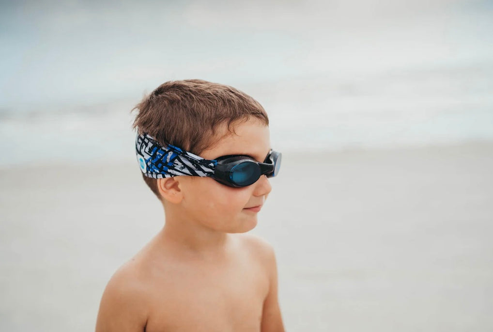 The Maze swim goggle features our tangle-free strap in a black, blue and gray abstract print. Paired with a black frame and lightly tinted blue lenses.