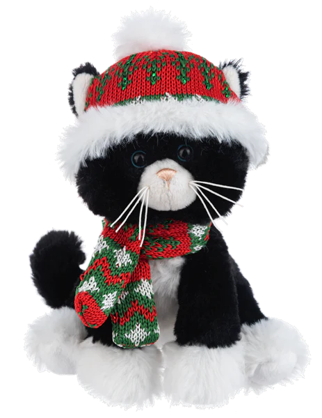 Meet your adorable new companion! This charming 6-inch black kitten sports a cozy winter hat, perfect for adding whimsy to any space. With its soft features and delightful expression, this little furry friend brings warmth and personality to shelves, desks, or nurseries. Whether you're a cat lover or looking for a quirky gift, this pint-sized pal is sure to bring smiles and cozy vibes wherever it goes.