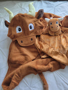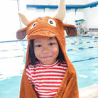 The longhorn is a very cool looking and well loved animal here and I'm on board with having it my new favorite animal! While he has the pointy horns, he's crafted from soft 100% cotton terry and is pretty happy and cuddly, and a NEW feature, this has little hand pockets to hold on to. Hook em' horns! -Machine wash -Towel size 27"x51", hood size 10"x 8.5" -Suitable for children ages 2 -8yrs -100% cotton -small pockets on top corners for little hands to easily hold the towel when wearing.