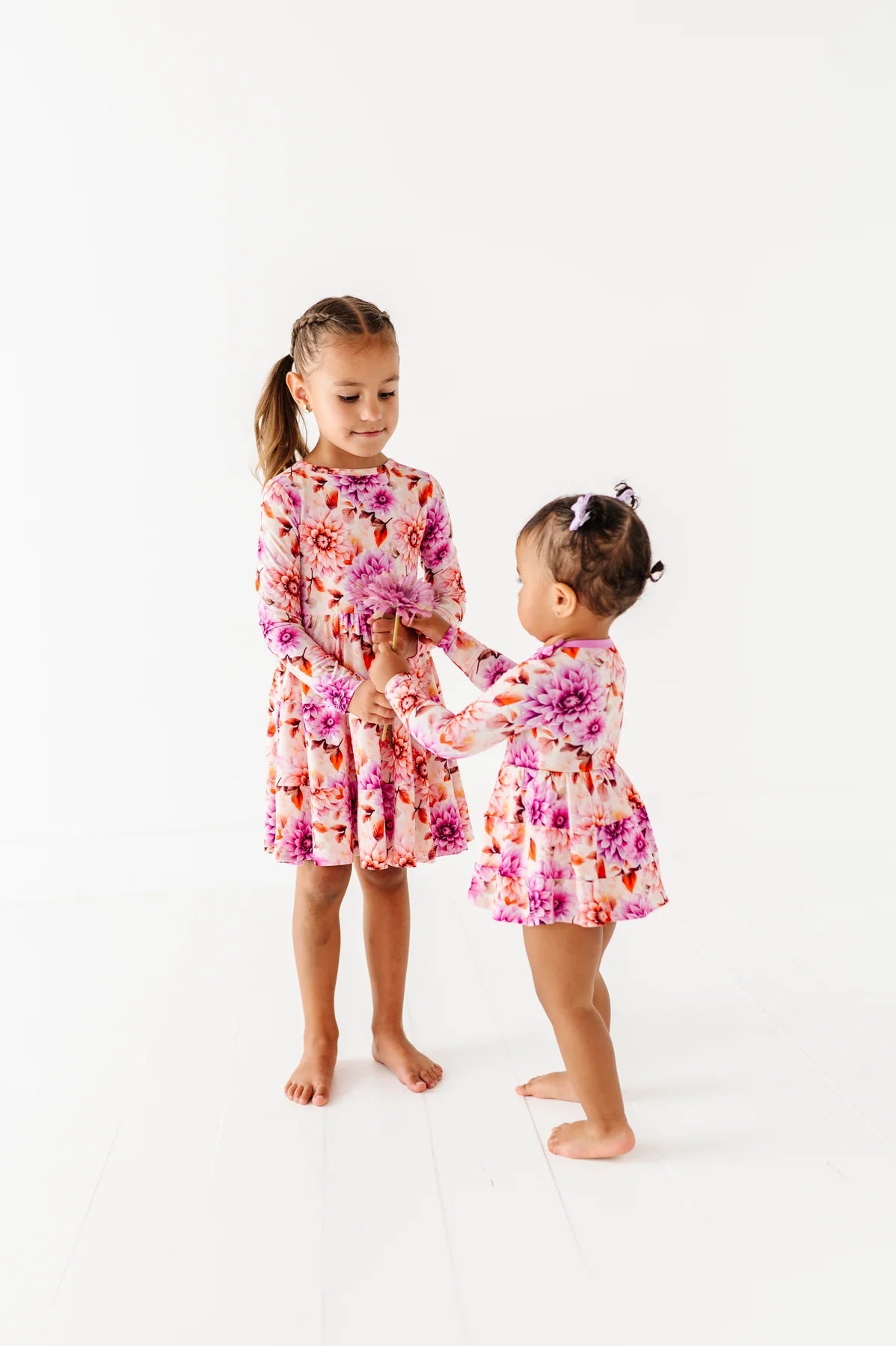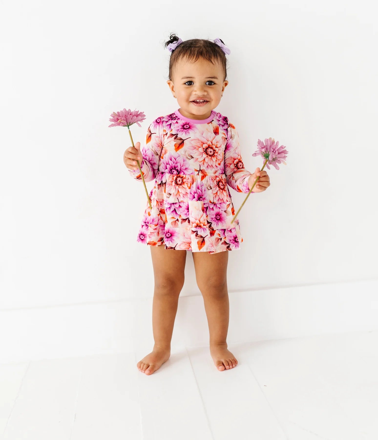 This darling infant dress brings cozy autumn charm to your tiniest fashionista. Featuring a cascading floral print in warm, muted hues, this long-sleeve dress is made from our signature bamboo blend—ultra-soft, stretchy, and gentle on sensitive skin. With tiered layers for extra twirl and hidden snaps for quick changes, it's as practical as it is picture-perfect. Ideal for seasonal snuggles, special outings, and everything in between.