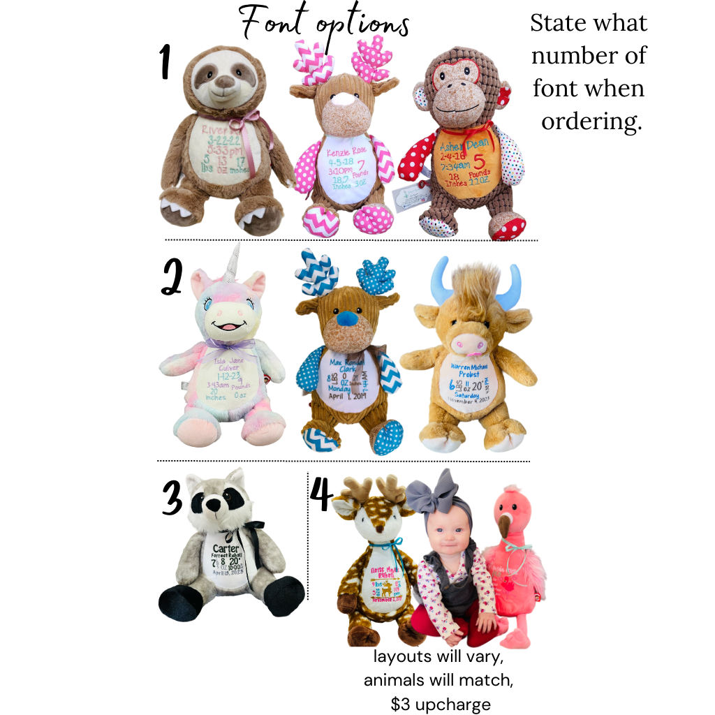 Embroidered with babies birth info, 10 business day turn around time. Choose two thread colors and number for font option!