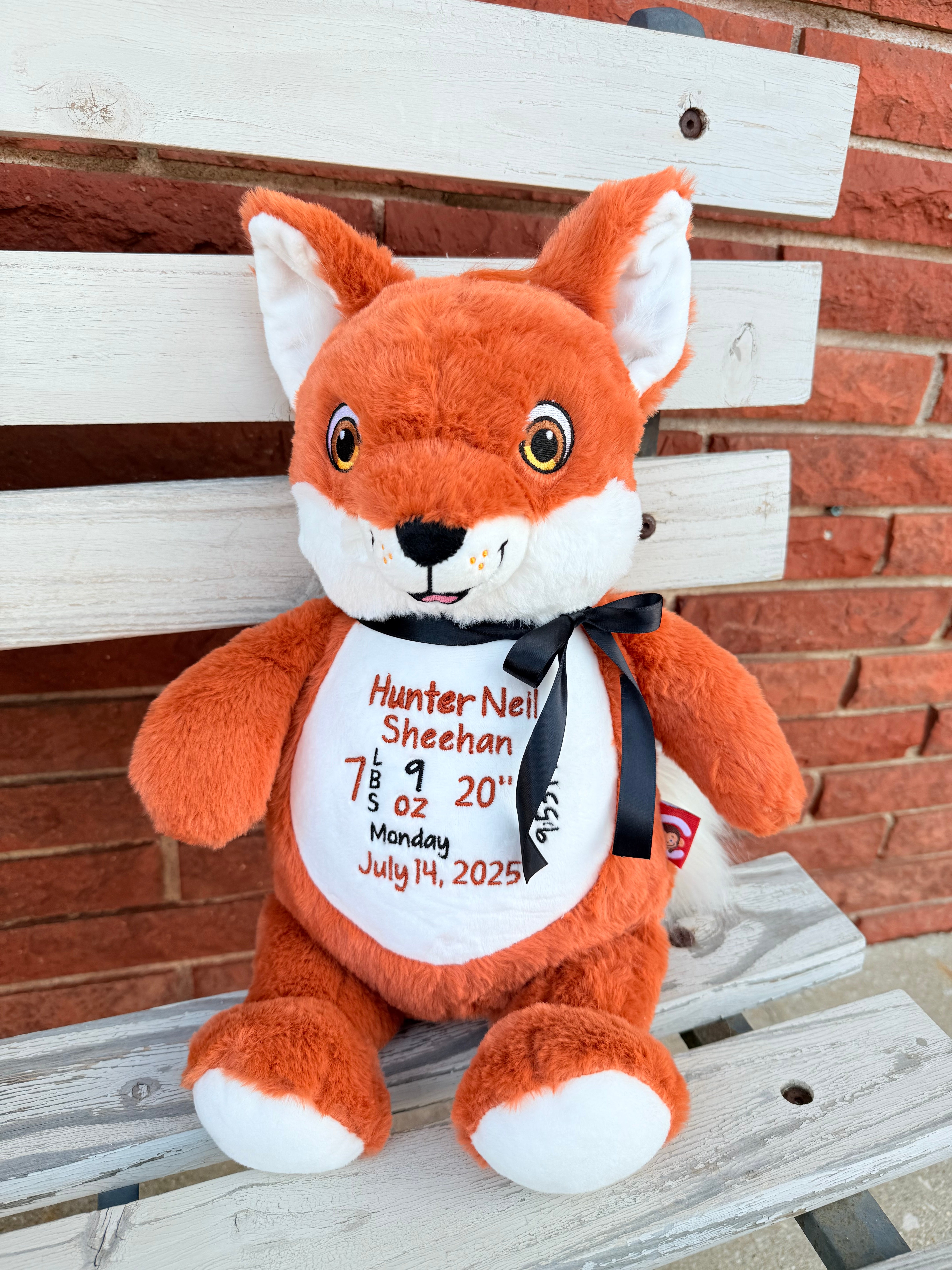 Add a whimsical touch to your nursery with our Fox Personalized Animal. Choose 1-2 colors for the thread to make it uniquely yours. Our handmade fox is personalized with your baby's birth stats and will be ready in just 2 weeks. (What a foxy addition to your little one's room!)