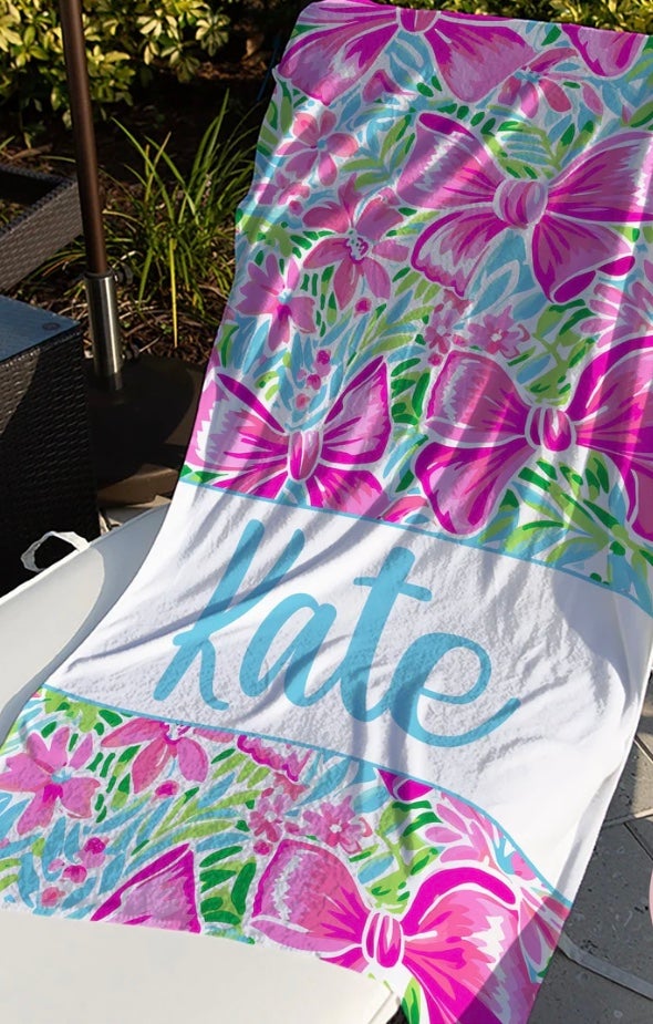 Enjoy some fun in the sun with our Pink Bow Personalized Beach Towel! Measuring 30x60, this towel is perfect for pool time, vacations, and girls' trips. Personalize it with a name for an extra special touch. It's the perfect gift for anyone who loves to lounge in style!