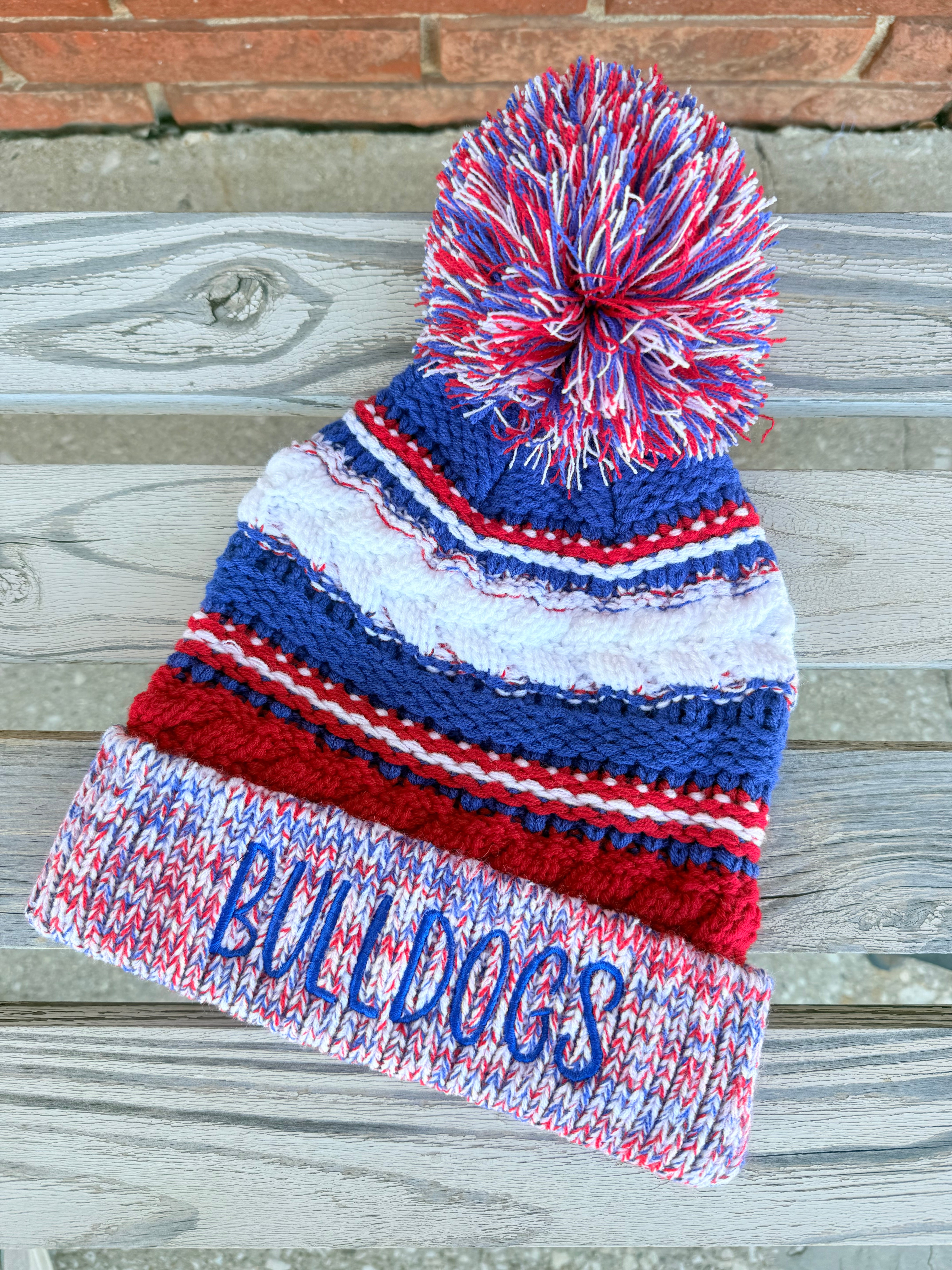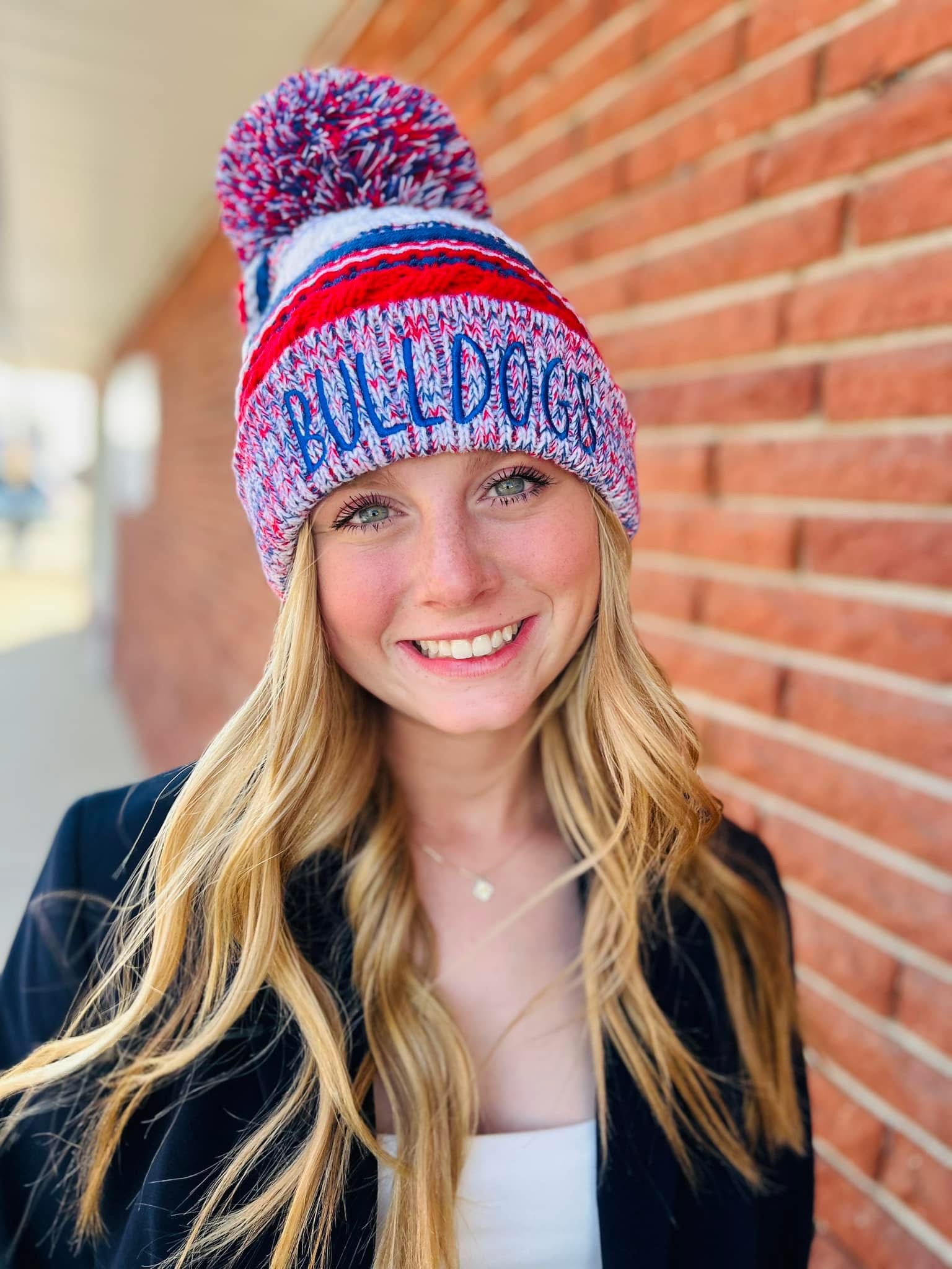 Rock your Bulldog pride with this cozy pom pom beanie! Perfect for fans of all ages, this one-size-fits-most beanie features custom embroidery of your favorite mascot. Whether you order ahead or snag one from our ready-made collection, you'll be cheering in style. Most custom orders ship within 10 business days—or grab a pre-made version and show your spirit right away!