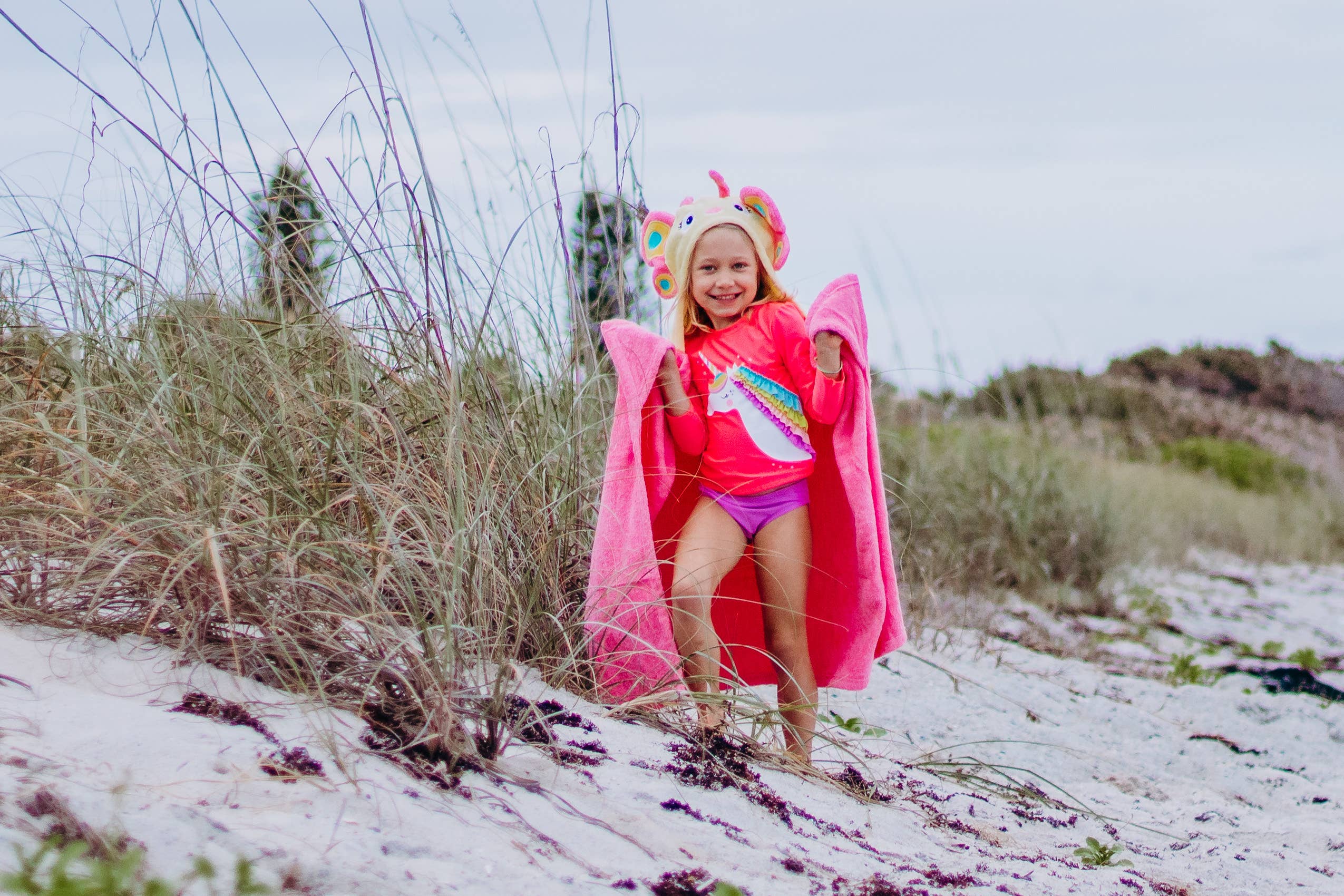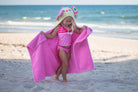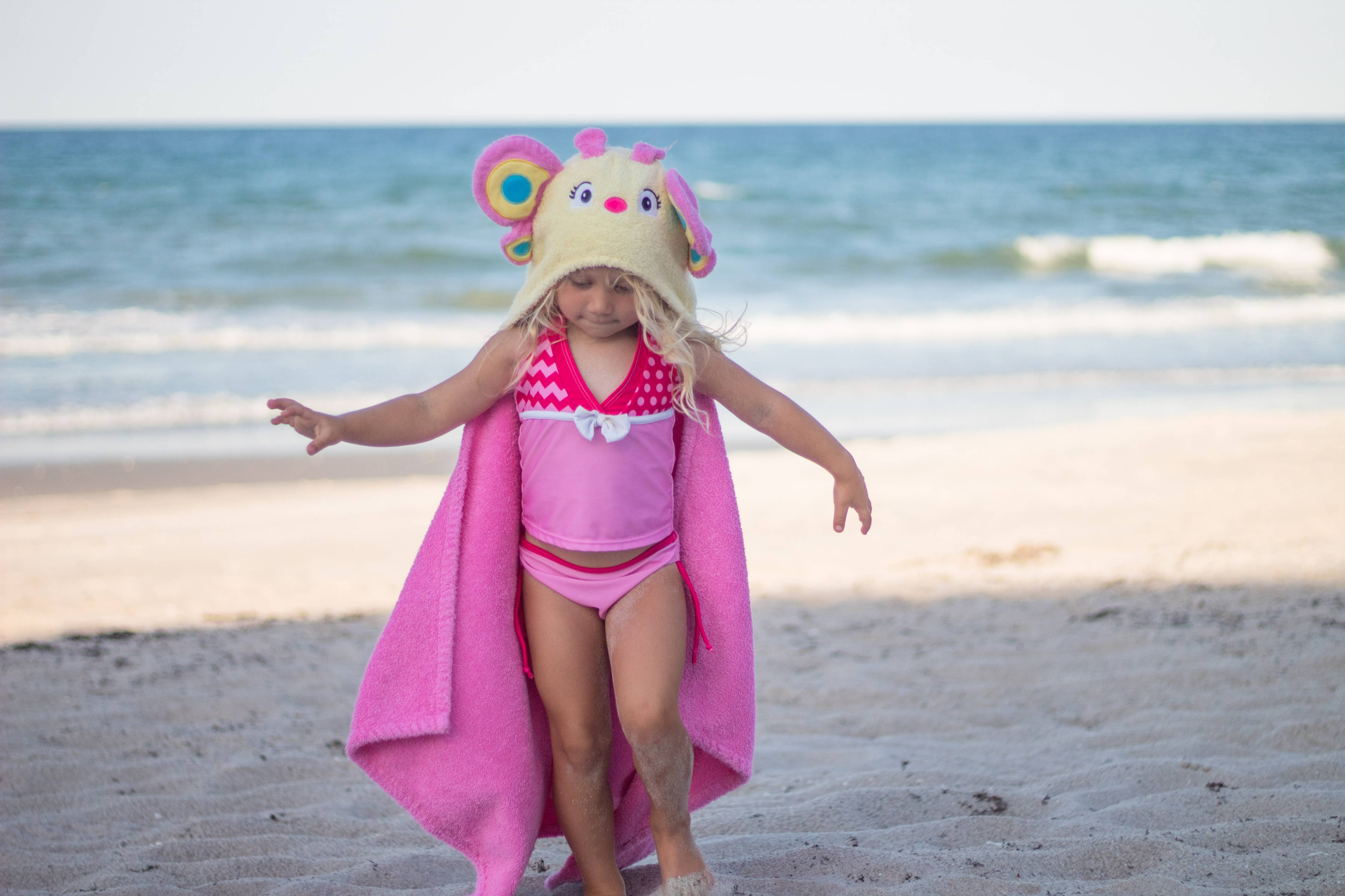 Fly around and dry off after a few runs thru the icy sprinkler, or after a bath, this 100% cotton terry towel will help get your beautiful Butterfly warm and dry! Machine wash -Towel size 27"x51", hood size 10"x 8.5" -Suitable for children ages 2 -8yrs -100% cotton -small pockets on top corners for little hands to easily hold the towel when wearing.