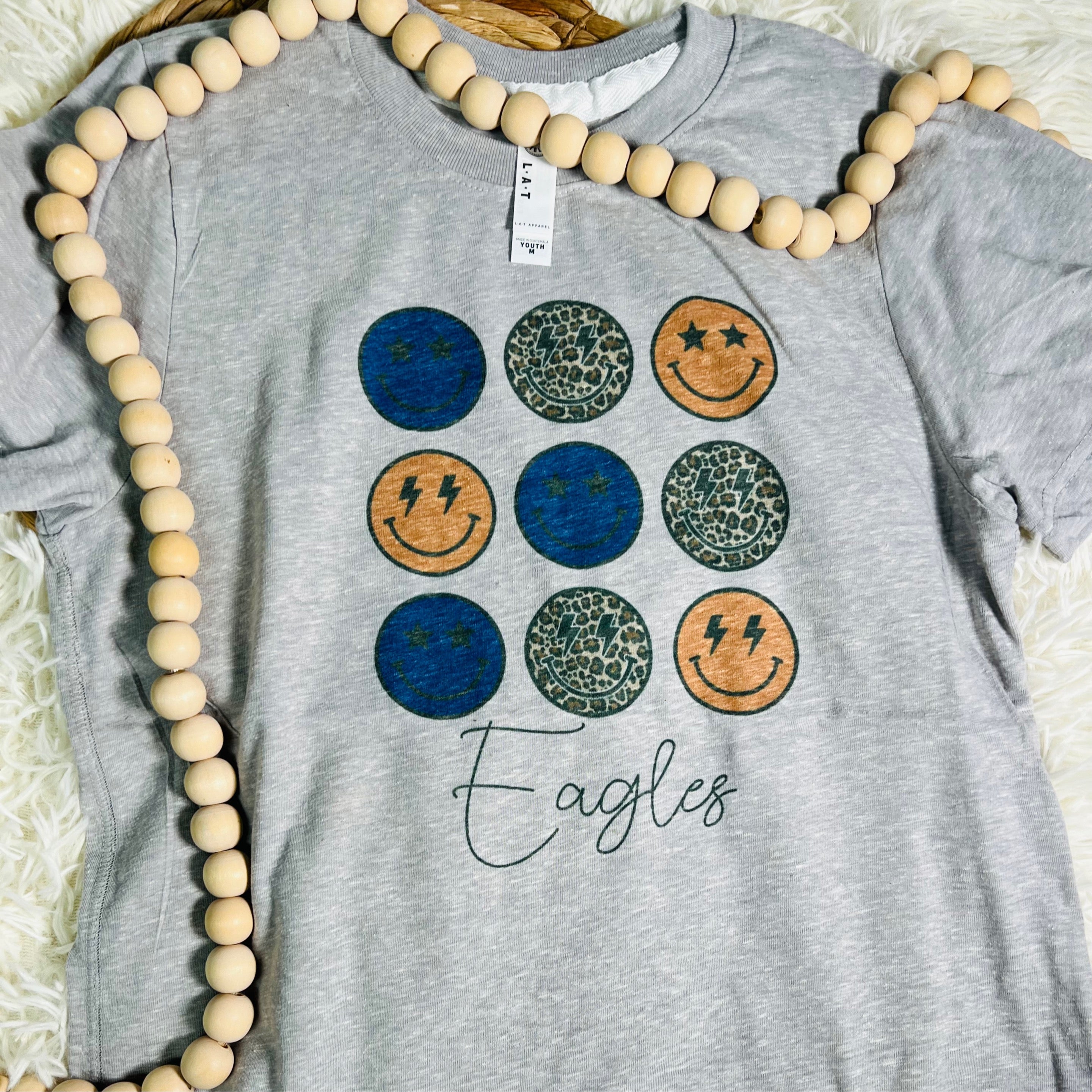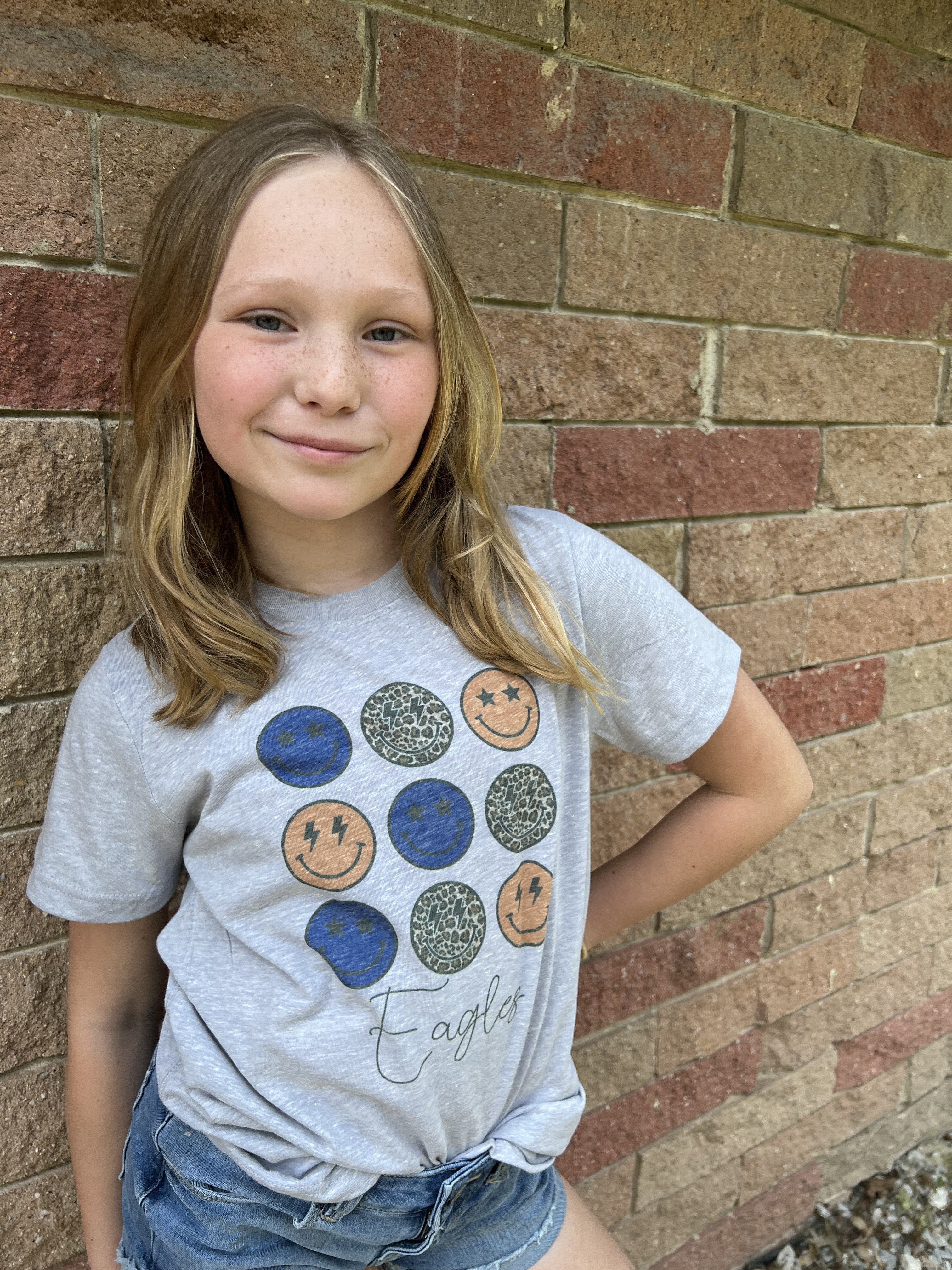 The "Eagles Smiley Face" youth printed tee is a fun and energetic way for kids to show their school spirit or love for the Eagles! Made from soft, high-quality fabric, this tee provides a comfortable and breathable fit, perfect for game days, school events, or casual everyday wear. Featuring a playful smiley face design with the Eagles name, this tee adds a cheerful and spirited vibe to any outfit. Whether it’s for cheering on the team or just showing off their love for the Eagles, this tee is a must-have for any young fan. Available in various sizes for the perfect fit—let the smiles and school pride shine!